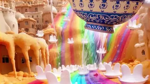 LTX-2 Pro Prompt: A giant teapot levitates above an upside‑down city. From its spout flows a river of rainbows, carrying paper boats shaped like human ears. Buildings are made of sugar and slowly dissolve in the warm golden rain. Aerial view, tracking shot, vibrant colors, whimsical mood, high detail, 60 fps smooth motion. Korean music.