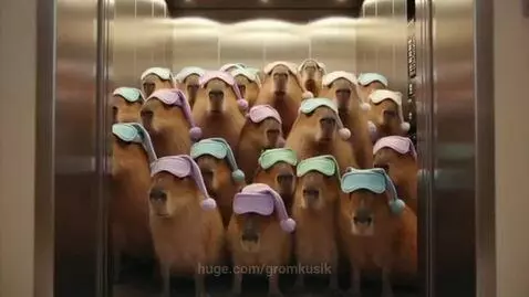 sora 2 Prompt: The elevator doors slowly slide open with a soft chime. Inside, the entire cabin is packed — floor to ceiling — with capybaras. Every single one is wearing tiny, cozy sleep caps and snug eye masks, perfectly arranged as if returning from a spa night. They all turn their heads toward the camera in eerie unison. Their calm, round faces now show mild annoyance. Soft, grumbling murmurs rise like a chorus of disgruntled therapists: “Mmmph… not again…”, “We were just getting comfortable…”, “Who pressed the button?…” The air hums with sleepy judgment. The doors stay open. No one moves. You hold your breath.