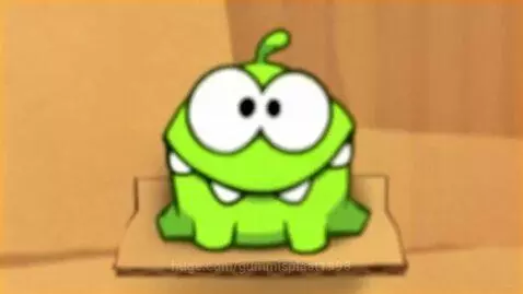 a green cartoon talking frog-esque looking creature, whose name is "Om Nom", introduces himself to the viewer alongside his quirky characteristics, like his love for candy