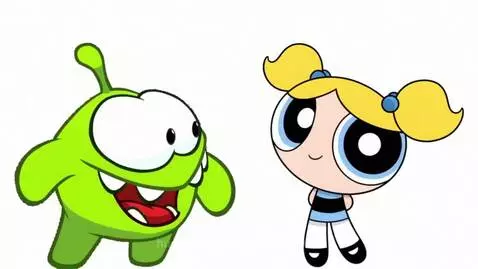 a green cartoon talking frog-esque looking creature, whose name is "Om Nom", meets a five-year-old kid with blond hair wearing a light blue dress, whose name is "Bubbles"