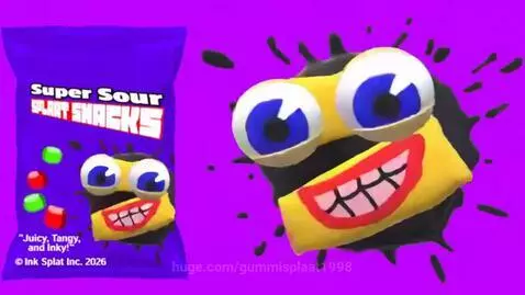 sora 2 Prompt: a korean commercial about a product named "Super Sour Splaat Snacks" featuring a talking cardboard-looking face with realistic eyes and a realistic mouth with purple-ish teeth on an ink splat in a plain pink background. the product on the left is a still image with no animation
