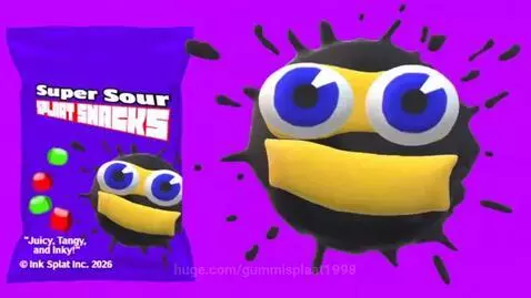 sora 2 Prompt: a european portuguese commercial about a product named "Super Sour Splaat Snacks" featuring a talking cardboard-looking face with realistic eyes and a realistic mouth with purple-ish teeth on an ink splat in a plain pink background. the product on the left is a still image with no animation