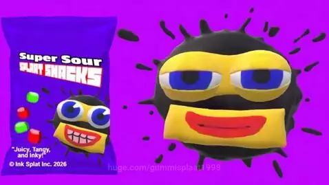 sora 2 Prompt: an arabic commercial about a product named "Super Sour Splaat Snacks" featuring a talking cardboard-looking face with realistic eyes and a realistic mouth with purple-ish teeth on an ink splat in a plain pink background. the product on the left is a still image with no animation