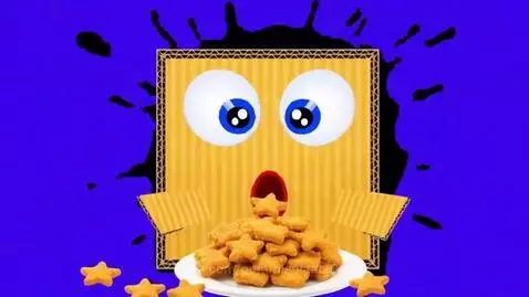 sora 2 Prompt: a talking cartoon cute cardboard-looking face with eyes and a mouth with white teeth in a plain indigo background eating way too much star-shaped chicken nuggets. after he eats a lot of star-shaped chicken nuggets he goes sugar crazy and starts twitching and spazzing out a lot