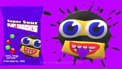 sora 2 Prompt: a dutch commercial about a product named "Super Sour Splaat Snacks" featuring a talking cardboard-looking face with realistic eyes and a realistic mouth with purple-ish teeth on an ink splat in a plain pink background. the product on the left is a still image with no animation