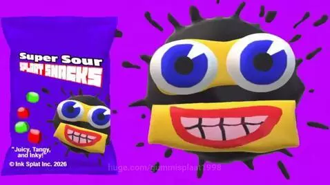 sora 2 Prompt: a hebrew commercial about a product named "Super Sour Splaat Snacks" featuring a talking cardboard-looking face with realistic eyes and a realistic mouth with purple-ish teeth on an ink splat in a plain pink background. the product on the left is a still image with no animation