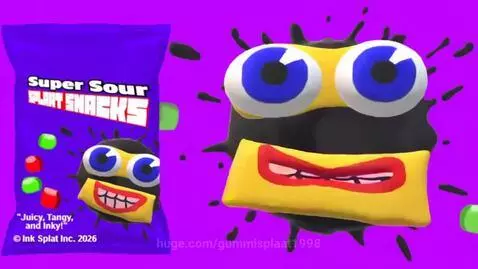 sora 2 Prompt: a indonesian commercial about a product named "Super Sour Splaat Snacks" featuring a talking cardboard-looking face with realistic eyes and a realistic mouth with purple-ish teeth on an ink splat in a plain pink background. the product on the left is a still image with no animation
