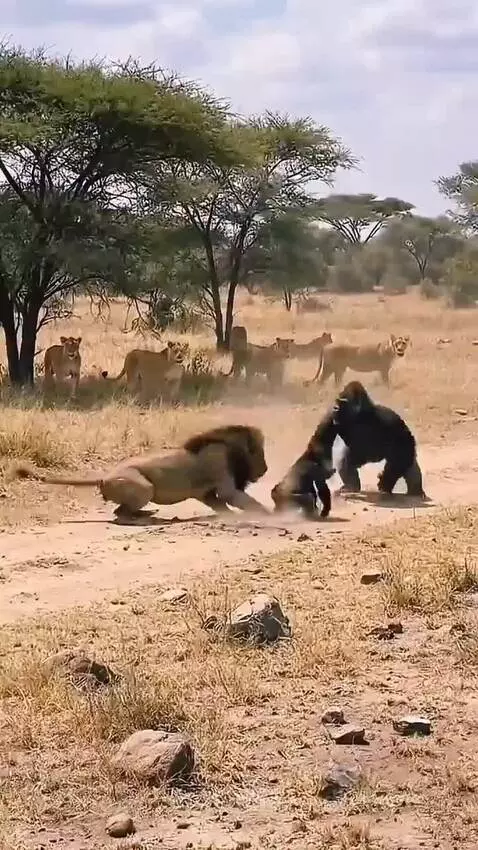 Gorilla fights lion