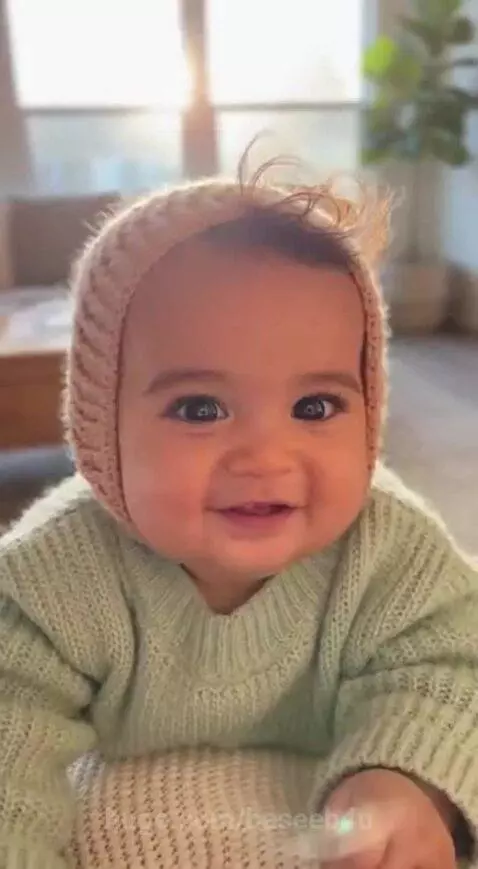 Sora Prompt: A 1-year-old baby with big expressive eyes laughing softly, wearing a cozy pastel outfit, sitting in a bright American living room, natural morning sunlight, ultra-realistic, cinematic close-up, heart-melting smile, soft skin texture, shallow depth of field, wholesome family vibe, 4K quality