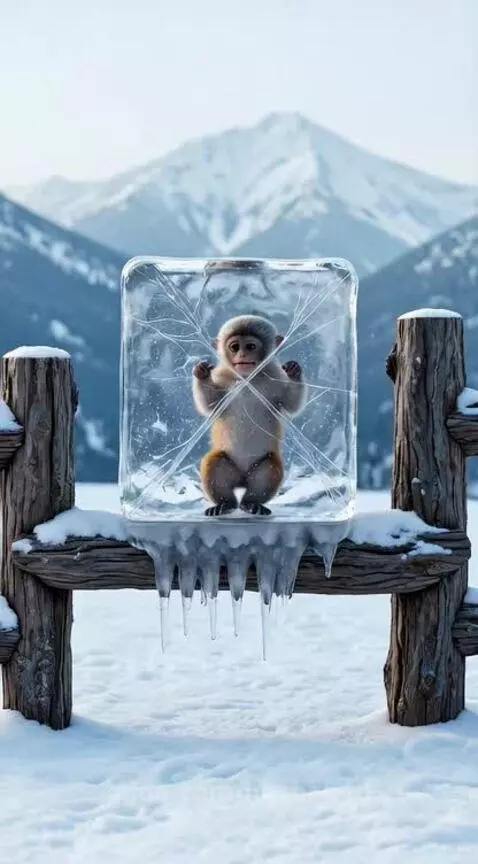 Grok Prompt: A realistic and emotional scene in a snowy mountain setting. A baby monkey is trapped inside a large, clear crystal ice block on a wooden fence. An adult mother monkey arrives, looking desperate and shocked. She uses her hands to frantically break and crack the ice. The ice shatters, and she carefully pulls the shivering baby monkey out of the ice block, hugging it closely. High-quality textures, cinematic lighting, and detailed fur.