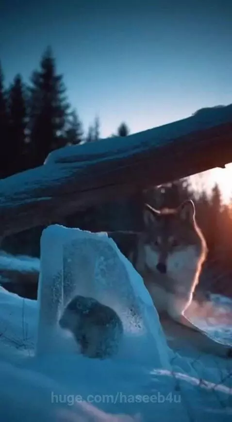 Sora Prompt: A dramatic snowy forest at dusk. A wolf pup is frozen inside a clear ice block beside a fallen tree. An adult mother wolf appears, eyes filled with fear. She claws and bites the ice desperately until it shatters. She gently lifts the weak pup and nuzzles it to restore warmth. Hyper-realistic fur, moody lighting, emotional cinematic depth.