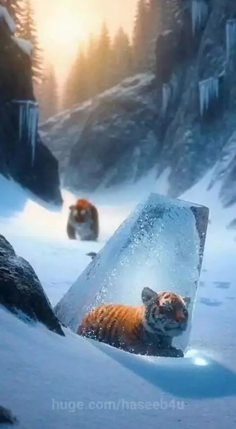 Sora Prompt: A frozen mountain valley. A baby tiger is trapped inside crystal ice near rocky cliffs. The mother tiger rushes in, growling in distress. She smashes the ice using her paws and head. The ice breaks, and she carefully drags the cub out, wrapping her body around it protectively. High-detail fur, dramatic shadows, cinematic realism.