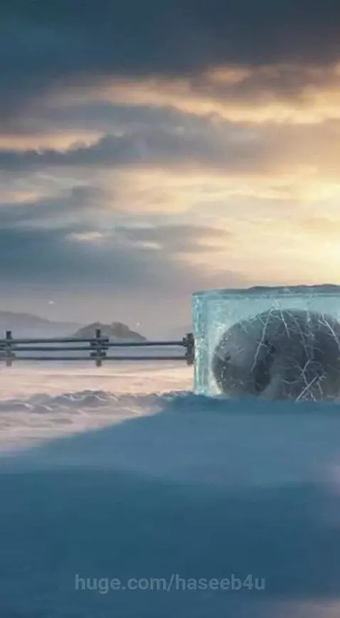 Sora Prompt: A snowy plateau under heavy clouds. A baby elephant is encased in a thick transparent ice block near a wooden fence. The mother elephant arrives trumpeting in panic. She strikes the ice with her tusks and trunk until it fractures and collapses. She lifts the baby gently and presses it against her body. Ultra-real textures, emotional cinematic lighting.