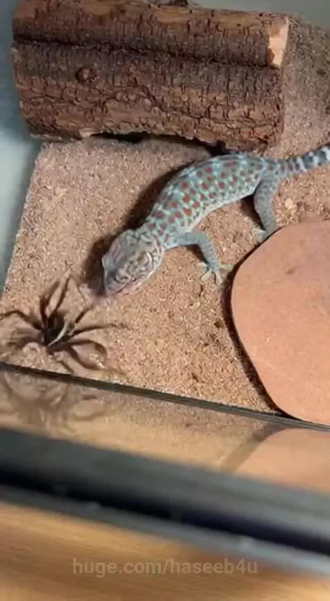 A tokay gecko and a large wolf spider suddenly collide near the cork bark. Camera shows natural hand tremor and small drifting motion, slight tilt correction mid-clip. The spider darts rapidly across the substrate while the gecko pivots sharply, tail whipping naturally. Scraping sounds and quick rustling dominate. They circle across the enclosure; the spider lunges but the gecko snaps forward, forcing it back toward the stone. Light contact with the glass produces a soft tap. The spider’s movement becomes uneven and slower, legs twitching irregularly as it tries to retreat. Quiet voice for 2–3 seconds: “That one’s fast… but it’s losing.” No music or added effects. Clip ends as the spider weakens but still shows faint movement.