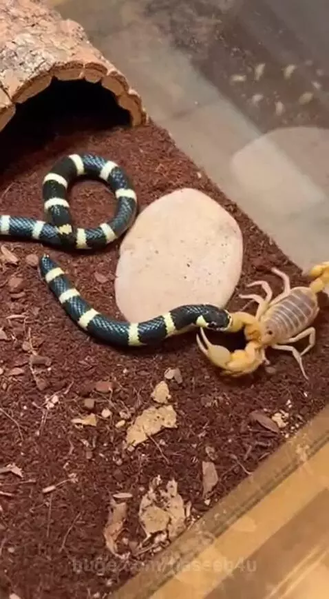 A king snake and a large desert scorpion confront each other near the flat stone. Handheld micro shake and small accidental tilt visible. The scorpion raises its stinger and advances; the snake moves in quick lateral motion, body sliding audibly across substrate. They traverse nearly the full terrarium space, brief contact with glass creating soft tapping sound. The snake strikes and partially coils, pressing the scorpion against uneven sand. The scorpion’s movement becomes irregular, tail lifting unevenly with twitching legs. Quiet observational voice: “It’s still fighting… yeah… not for long.” No music, no cinematic effects. Clip ends naturally as the scorpion weakens but continues faint movement.