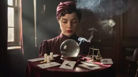 Kling 2.5 Turbo (pro) Prompt: A beautiful 1940s-style fortune teller with red lips and a headscarf, gazing into a smoky crystal ball. She is seated at a small round table covered in a velvet cloth, with tarot cards scattered around. Volumetric lighting streams through a window, mixing with the smoke. Vintage aesthetic, grainy film texture, warm color palette, atmosphere of mystery and divination.
