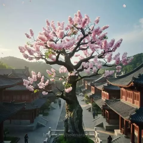 In ancient Asian city a Sakura tree is blossom with pink flowers