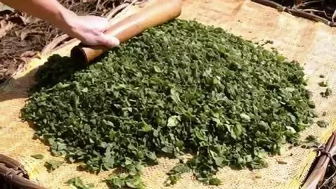 Scene 3: spread crushed grind leaves on mats in the sun. Then turn it over to dry.