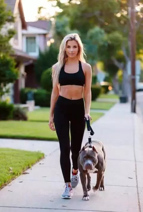 Woman walking dog doing two push-ups