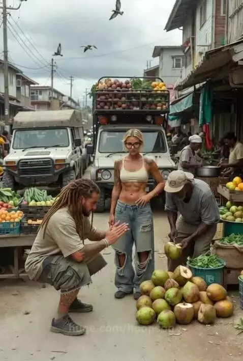 Rustic scene in the Caribbean environment, customers purchasing coconut mail. Customer decides to jump into some squats.