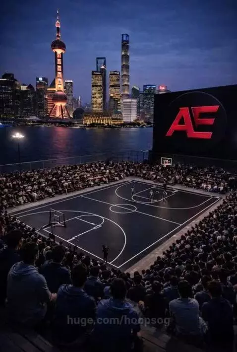 Basketball game on beautiful black court under the parallel towel light Shanghai