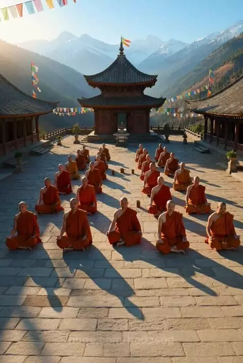A temple buried deep into mountains with monks in a courtyard in a meditative stance one Monrose’s execute crunches