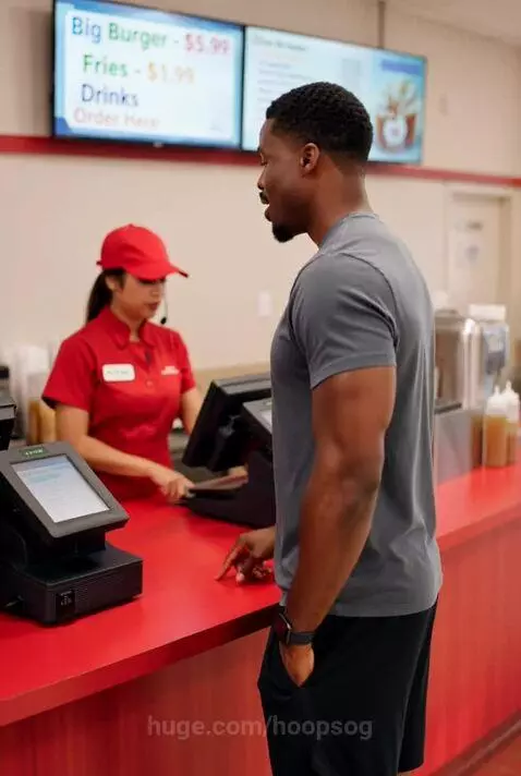 Young man standing at the fast food restaurant, ordering food, execute squats before eating