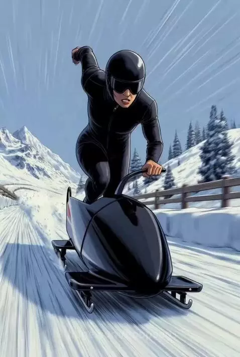 A mono Bob pilot dressed in all black gives her all as she races down the slopes to make the best time