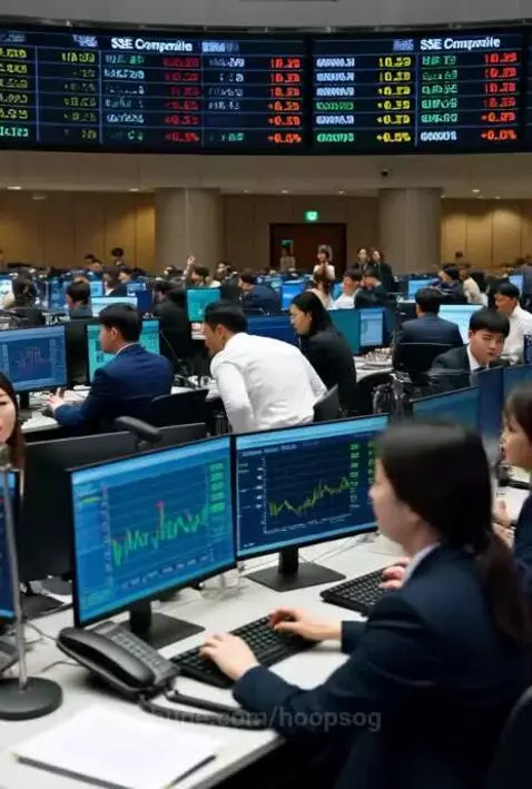 Shanghai trading room, Shanghai, China high energy trader stands up execute two squats sits back down to work