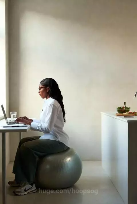 Young black female entrepreneurial sitting at her desk and a bouncy ball gets up to enjoy a nice salad