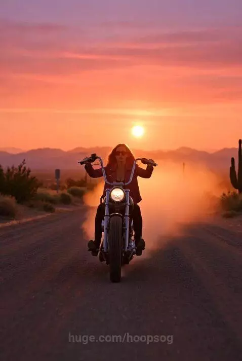 A female and pink jacket, full black boots Harley riding through