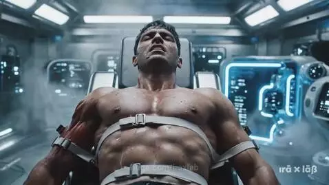 Gemini Prompt: In a sterile sci-fi lab, a restrained man undergoes a breathtaking transformation — veins glowing, metal patterns emerging under his skin as lights flicker and steam rises. The scene builds from silence to power, ending with his calm, awakened hybrid form staring straight ahead.