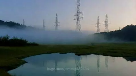 Mist rolling over shallow ponds, electric towers faintly in the distance, camera dips below water to reveal a faint blue shimmer.