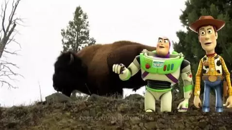 Woody And Buzz Pete on Wild Bison Woody Says "Look at these Ones Bison Buzz. Buzz Says," You got it woody." Woody "Good Job Buzz." Buzz Says " Woody let's Go Home." Buzz And Woody Ride On Bison In Home