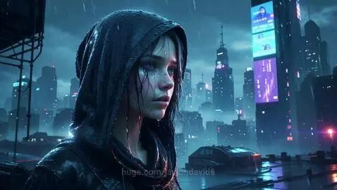 Kling 2.5 Turbo (pro) Prompt: Style: 2099 year. Cyberpunk cinematic short film, ultra-detailed, photorealistic, realistic lighting and materials, volumetric light and shadow, soft depth of field, HDR, 8K quality. Color palette: deep cyan, magenta, violet and cold neon tones with soft ambient haze. Atmosphere: moody, reflective, slightly melancholic but filled with inner strength. Textures: wet asphalt, glass reflections, flickering holograms, metallic surfaces, neon bokeh. Camera setup: Anamorphic lens, cinematic framing, shallow focus, low-angle or mid-shot depending on emotion, realistic motion blur, light flares and particle effects. Optional drone sweeps or slow panning for environmental shots. Lighting: Mixed neon and ambient backlight with secondary reflections. Use red or purple accent lights for emotional tension, blue or teal for calm introspection. Hooded yong woman standing on rooftop. City rooftop under heavy rain. Drops slide down her pale face. Neon reflections fade into gray. For a brief moment — no code, no systems. Only the sensation of being alive.