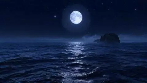 Kling 1.0 (standard) Prompt: Duration: 19s, 16:9, 1080p. Cinematic photorealistic dark navy night sea. Horizon with a bright full moon and stars reflecting on water. Gentle ripples on the surface, faint mist. A large textured rock, half-hidden in shadow, sits far out in the water. Atmosphere: mystical, siren-like, melancholic. Camera: slow wide shot, subtle shimmer of moonlight.