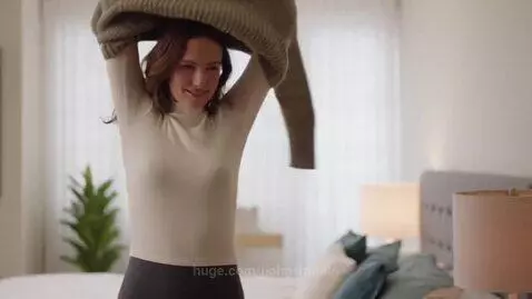 A woman is putting on her wool sweater-dress