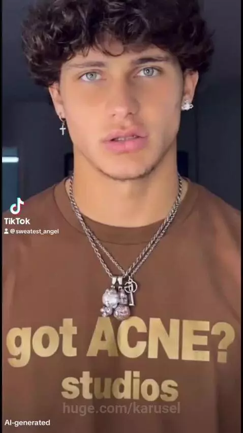 A young man with curly hair wears a brown "got ACNE? studios" shirt, layered necklaces with charms, and earrings, posing indoors.
