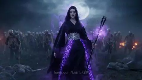 sora 2 Prompt: A striking necromancer woman strides confidently through a moonlit battlefield, her flowing dark robes embroidered with glowing arcane sigils that pulse with violet energy. Her pale skin contrasts sharply with the inky tendrils of dark magic swirling around her, and her piercing crimson eyes burn with otherworldly power. Behind her, a grotesque horde of reanimated warriors shambles forward—some clad in rusted armor, others barely more than skeletal remains held together by dark magic.