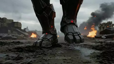 Seedance 1.5 Pro Prompt: A towering figure clad in jagged obsidian armor strides through a battlefield of smoldering ruins, their every step making the earth tremble. The warrior helmet - a horned, faceless visage - gleams with the reflected glow of dying fires, while a colossal zweihander, its blade etched with infernal runes, drags behind them, leaving a trail of crackling embers.