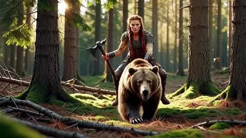 Athletic barbarian woman in chainmail with an axe is riding a mighty grizzly bear in forest.