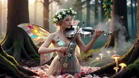 Wan 2.5 Preview Prompt: A luminous fairy with delicate, translucent wings, glowing softly in twilight, playing an ornate silver violin amidst floating petals and fireflies, fantasy realism style, close-up side angle capturing her serene expression, golden hour lighting filtering through ancient trees, magical notes manifesting as visible glowing tendrils of light, surrounded by a misty enchanted forest with bioluminescent plants, intricate details on her floral crown and gossamer dress,