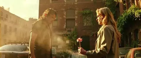 LTX-2 Pro Prompt: Hauntingly beautiful post-apocalyptic street scene, a blonde woman with windswept hair gently offering a single wildflower to a decaying zombie, overgrown vines crawling up crumbling brick buildings and rusted cars, the zombie's tattered clothes and exposed bone contrasting with the delicate pink flower, soft golden hour light filtering through dusty air particles, creating an ethereal glow around the poignant moment.
