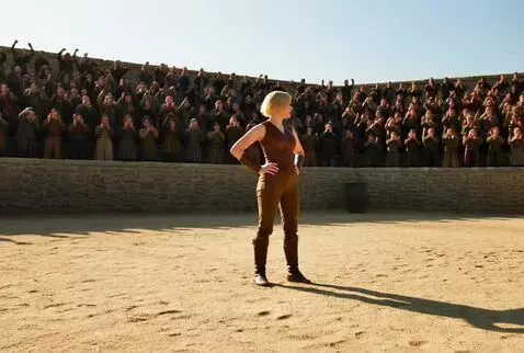 Blonde woman defeats barbarian on arena