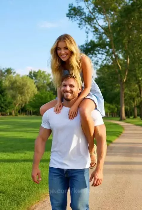 Pretty blonde riding on man's shoulders