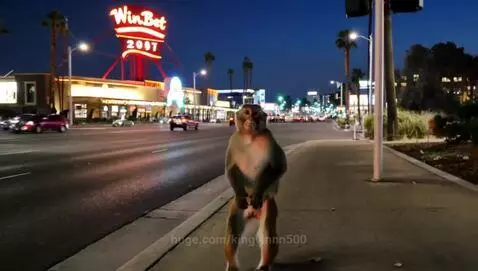Luma Dream Machine Ray2 Prompt: A monkey stands on a busy boulevard, looking toward a flashy casino with a glowing red sign that says 'WinBet' in bold white letters.