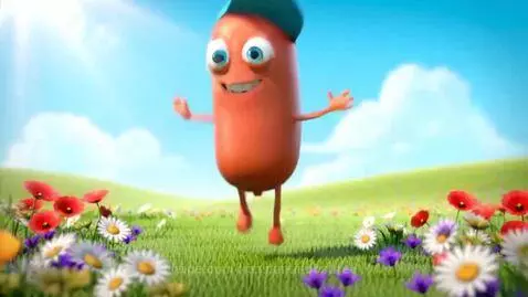 sora 2 Prompt: Create a vivid animated video with this funny character-a fat sausage in a cap with big blue eyes, thin arms, full legs and a smiling mouth. Let him jump around the flower field, laugh, greet the audience, make funny gestures and dance.