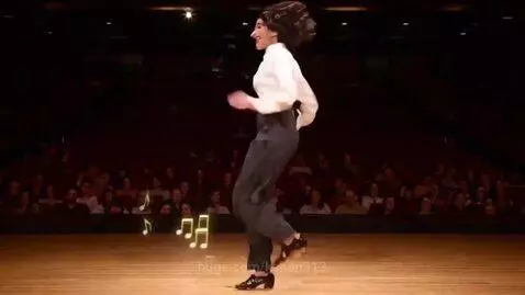 A woman tap dancing stage with fan blowing her hair . As she taps positive music and song comes out of her shoes 2 minutes for hope and unity. Her singing make people so happy.