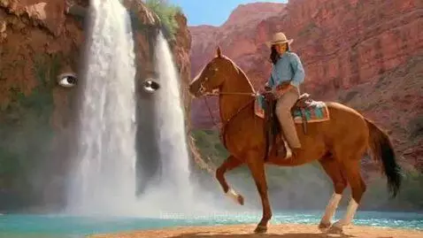 A multiracial cowgirl riding on dancing horse at grand canyon waterfalls . With water falls speaking words of self esteem.