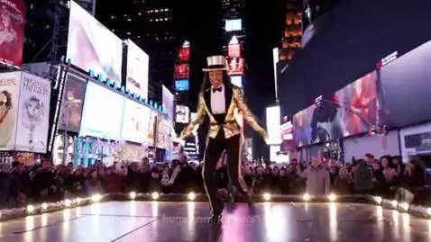 sora 2 Prompt: A dancer that moves with fancy foot work. Wearing a gold top hat and gold tuxedo . A very beautiful woman dancing across the stage and doing a split. Then singing a song about never giving up. Then she performs magic trick with white doves flying in the air that vanish. In the middle of Time Square in New York City.